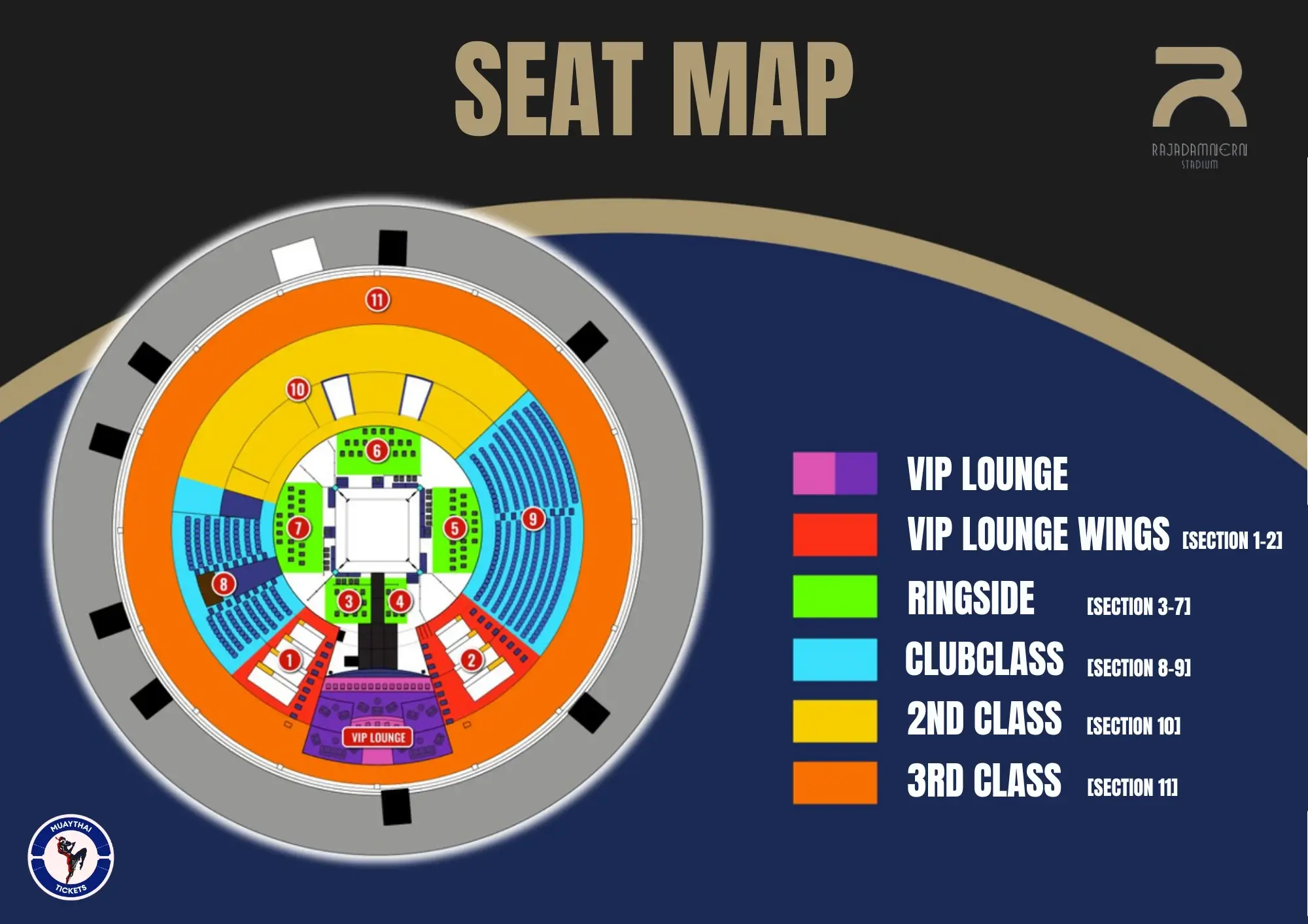 Explore the seating map of Rajadamnern Stadium, the historic birthplace of Muay Thai. Experience the thrill of world-class fights from various seating options, offering the best views of the action in this legendary arena.