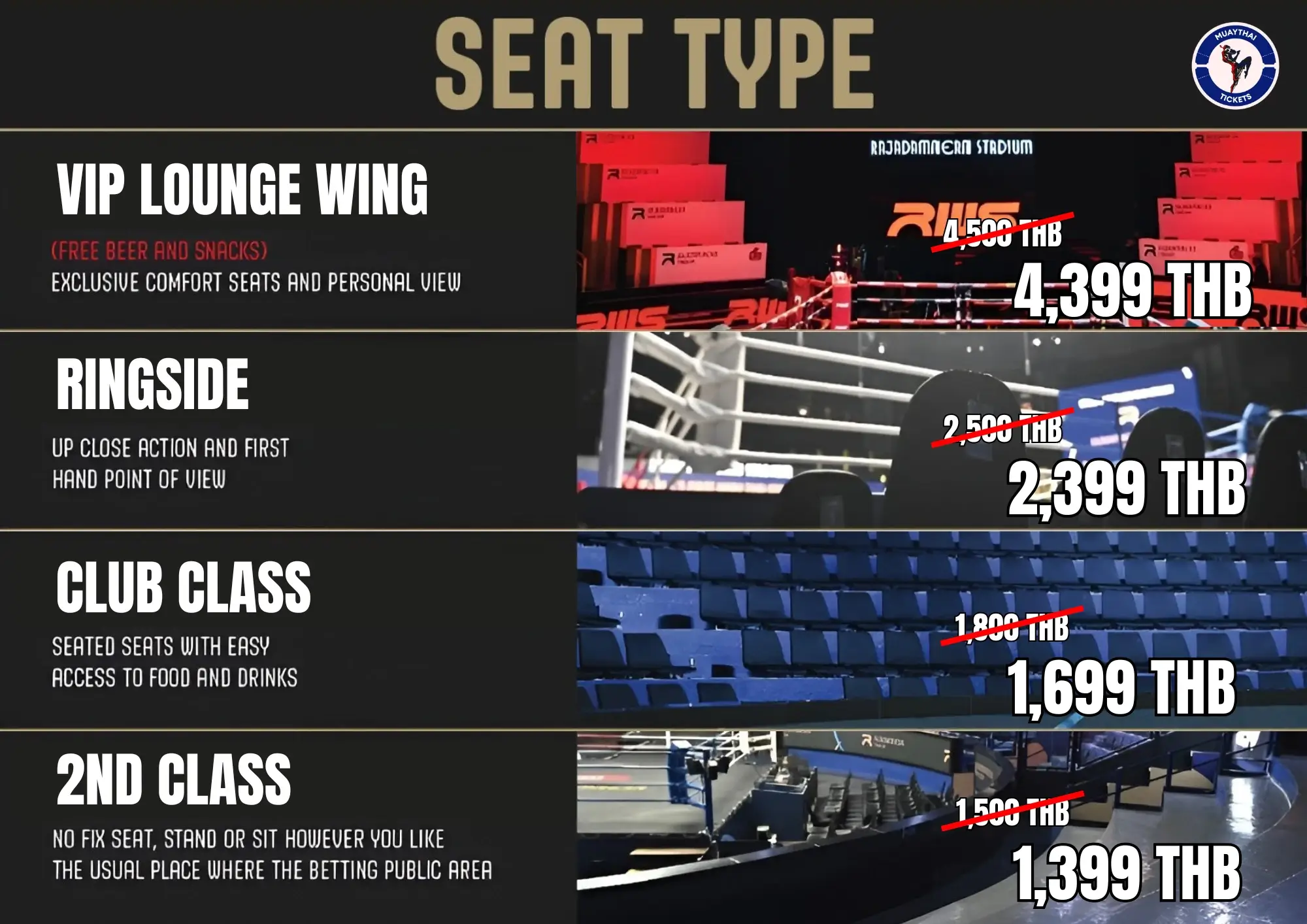 Choose your seat and experience the electrifying atmosphere of Muay Thai at its birthplace. Secure your spot for an unforgettable fight night!